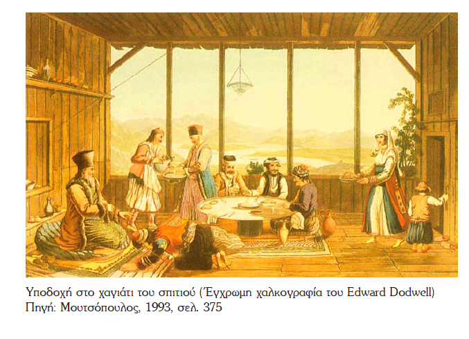 Μια εικόνα της καθημερινής λειτουργίας του χαγιατιού μας έχει διασώσει η έγχρωμη χαλκογραφία του Edward Dodwell που απεικονίζει ένα δείπνο στο χαγιάτι της κατοικίας του επισκόπου της Άμφισσας στο Χρισό. Ο επίσκοπος καθισμένος σταυροπόδι, σύμφωνα με την οθωμανική συνήθεια, πάνω σε χαμηλά στρωσίδια δέχεται την έκφραση σεβασμού με ένα «εδαφιαίον» προσκύνημα ενός ραγιά χριστιανού. Με τον ίδιο τρόπο κάθονται στο κέντρο του χαγιατιού, γύρω από ένα χαμηλό σοφρά, τρεις δημογέροντες ή κάποιοι τσορμπατζήδες ή μουχτάρηδες, χριστιανοί της περιοχής δικαιοδοσίας του επίσκοπου, ενώ ένας τέταρτος που μόλις ανέβηκε στο χαγιάτι «νίπτει τας χείρας του» σε λεκανίδιο με νερό που χύνει από χάλκινη «γκιούμι» ένας υπηρέτης φουστανελάς. Μια γυναίκα υπηρετεί τους επισκέπτες στο τραπέζι. Πρόκειται για χαρακτηριστική σκηνή των αρχών του 19ου αιώνα που απεικονίζει πολύ παραστατικά και την ενδυματολογία, αλλά και τα έθιμα που επικρατούσαν και στους χριστιανούς ραγιάδες την εποχή αυτή, και που ελάχιστα διέφεραν από τα τουρκικά αντίστοιχα. Ακόμη και το μικρό παιδί με τα σαλβάρια, το γιλέκι και το τουρμπάνι σε τίποτα δεν θα διέφερε από το γιο ενός γειτονικού Οθωμανού αγά (Μουτσόπουλος, 1993 σελ. 378).