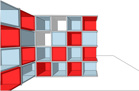 Στα περισσότερα κενά της βιβλιοθήκης μπορούν να τοποθετηθούν κουτιά σε έντονα χρώματα. Μερικά κουτιά μπορούν να κοιτούν προς το κρεβάτι και μερικά προς τη περιοχή εργασίας.