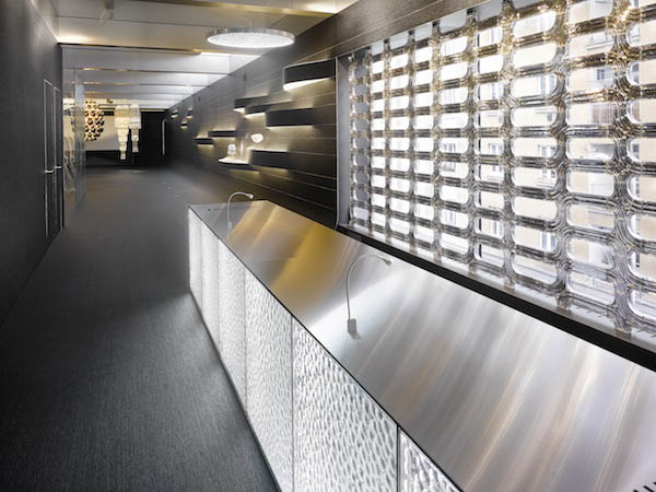 Ηλεκτροχρωμικό γυαλί με επίστρωση, η οποία με εφαρμογή χαμηλής ηλεκτρικής τάσης ρυθμίζει την ορατότητα μέσω του γυαλιού (από διαφανές γίνεται γαλακτόχρωμο).