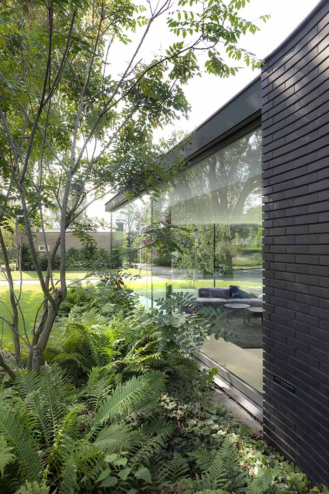 Όλες οι προσόψεις από μαύρο τούβλο κρύβουν και δείχνουν το φυσικό περιβάλλον, ενώ οι μεγάλες ενσωματωμένες ζαρντινιέρες με πράσινο είναι τοποθετημένες ακριβώς στο μπροστινό μέρος του κτηρίου. Το σπίτι είναι κατασκευασμένο για αποτελεσματική χρήση ενέργειας, με αποθήκευση ενέργειας, γεωθερμική αντλία θερμότητας και ηλιακούς συλλέκτες στην οροφή. Ο στόχος ήταν να συνδεθεί το εσωτερικό με το εξωτερικό με φυσικό τρόπο.