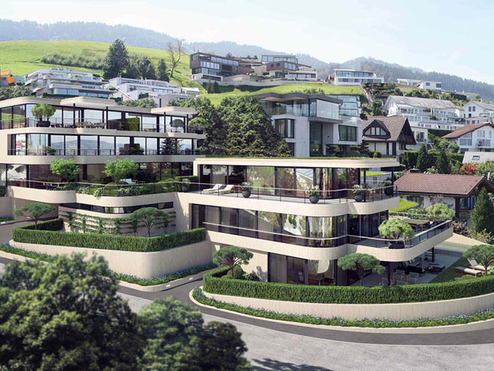 Η αρκετή απόσταση από τα γειτονικά σπίτια, σχεδιασμένη επίσης από την Simmen Group, ο ήσυχος, λίγο πολυσύχναστος δρόμος της γειτονιάς, ο βέλτιστος προσανατολισμός, καθώς και η επικλινής τοποθεσία στην πλαγιά του λόφου με φανταστική θέα στη λίμνη της Ζυρίχης, αποτελούν ένα εξαιρετικό πλαίσιο για το πολυτελές αυτό οικοδομικό έργο.