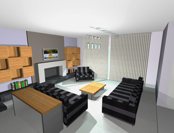 Συγχρόνως με τη συνολική οργάνωση των επίπλων του καθιστικού θέλει να εκμεταλλευτεί τη θέα από τη μεγάλη μπαλκονόπορτα, να επιτύχει ευρυχωρία και άνετη μετακίνηση και να ενσωματώσει αρμονικά το σκαλοπάτι προς την κουζίνα. Μας ενημέρωσε ότι το στυλ διακόσμησης του σπιτιού είναι σύγχρονο.