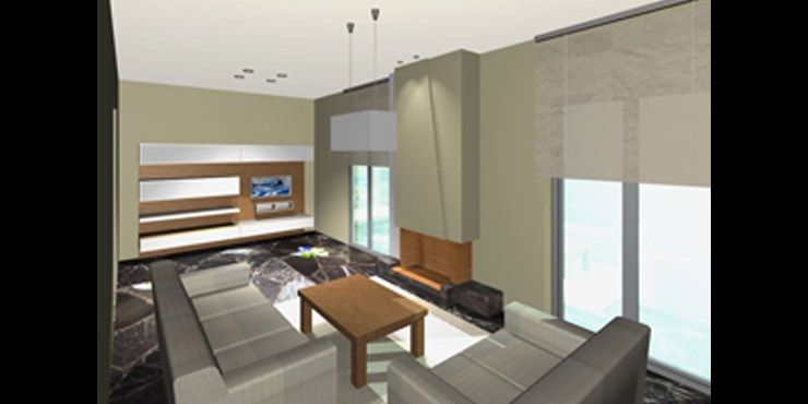 Στο καθιστικό το τζάκι κυριαρχεί στο χώρο. Τα μαρμάρινα δάπεδα επίσης αποτελούν ένα έντονο στοιχείο. Ως εκ τούτου, τα υπόλοιπα στοιχεία του χώρου (χρώματα, έπιπλα, υφάσματα) πρέπει να είναι όσο το δυνατόν πιο απλά.
