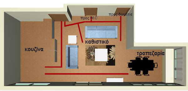 Οι δύο πόρτες, μία για το W.C και μία για την περιοχή των δωματίων ορίζουν έναν άλλο διάδρομο κυκλοφορίας.