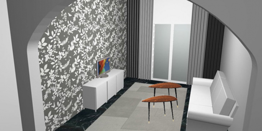 Αν επιλέξετε γκρι χρώμα για τους τοίχους μπορείτε να το συνδυάσετε με ταπετσαρία στον τοίχο με τη σύνθεση της TV. Επιλέξτε ταπετσαρία με γκρι φόντο και λευκά σχέδια για να δώσει αίσθημα ευρυχωρίας στο χώρο, καθώς τον περιγράφετε μακρόστενο και σχετικά μικρό. Συμπληρώστε με κουρτίνες που κρέμονται από την οροφή σε υπόλευκη απόχρωση με σκούρες τραπαρίες. Επίσης μπορείτε να διαλέξετε ανοιχτόχρωμο χαλί για να “σπάσει” την έντονη αίσθηση του μαύρου χρώματος στο δάπεδο. Ωστόσο, να σημειώσουμε ότι ο συνδυασμός λευκού-μαύρου-γκρι επικρατεί στο χώρο με εξαίρεση την πινελιά του χρώματος της καρυδιάς στα τραπεζάκια και δίνει μια αίσθηση αυστηρότητας και δωρικότητας. Μπορείτε να επιλέξετε διακριτικές πινελιές χρώματος σε αντικείμενα και λευκά είδη σαλονιού, χαλί κλπ.