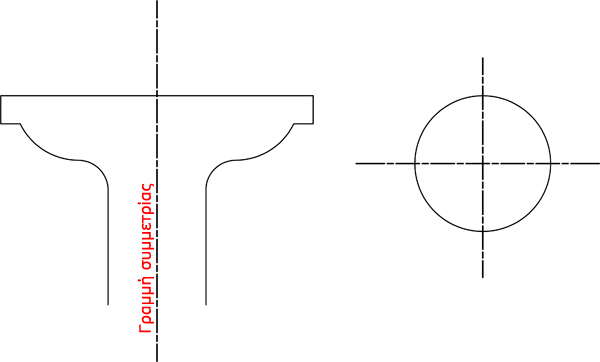 Β. Οι αξονικές γραμμές χρησιμοποιούνται για να δηλώσουν έναν ή δύο άξονες συμμετρίας. Δύο τεμνόμενες γραμμές συμμετρίας ορίζουν το κέντρο κυκλικών αντικειμένων. Οι γραμμές αυτές σχεδιάζονται με την εναλλαγή μεγάλων και πολύ μικρών ισομήκων τμημάτων ή με την εναλλαγή ευθύγραμμων τμημάτων και τελειών (παύλα - τελεία - παύλα)